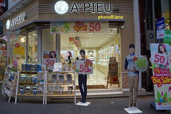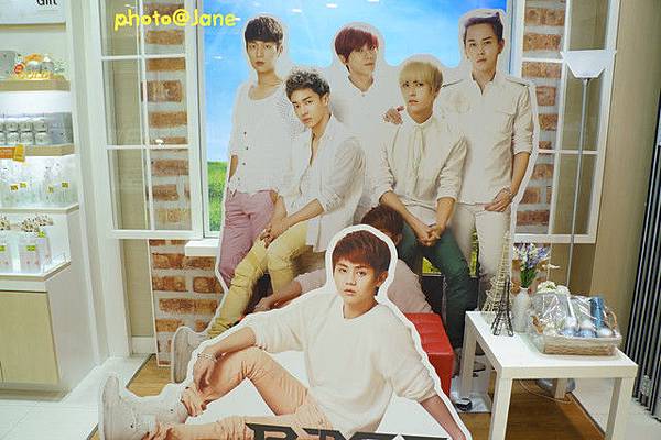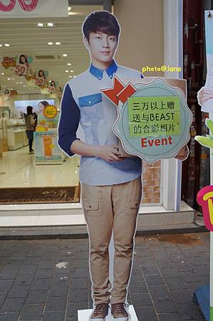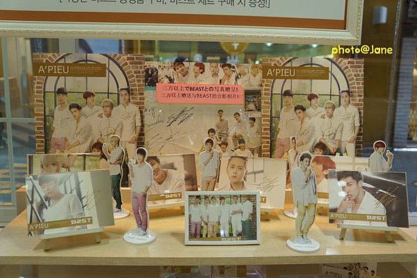 接著就來到BEAST代言的彩妝店「A'PIEU」,這也是我的計畫中的一站。說是蠻新的牌子,可是我在明洞就看的兩三間分店,連梨大跟永登浦地下街都有,所以不用擔心會找不到。門口就放著斗俊跟起光的人型看板,上面寫著滿三萬元之後還可以跟BEAST看板拍拍立得。
