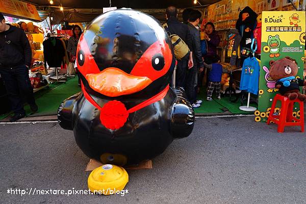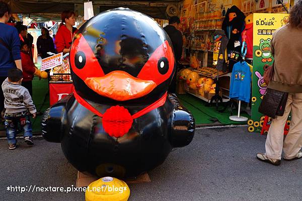 繼續往前走,來到了小鴨商場,所有的攤販都在販賣黃色小鴨的東西。還有另一隻金雞鴨佇立再另外一頭。