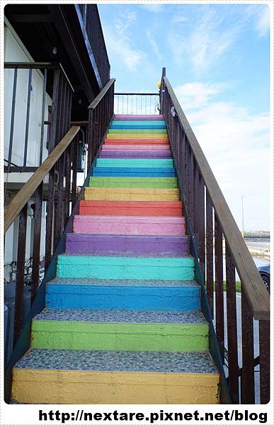備有停車場,自行開車、騎車的朋友不用擔心停車的問題,進到一樓的櫃檯簡單辦理手續,民宿主人會經由這繽紛的樓梯帶領房客上二樓。