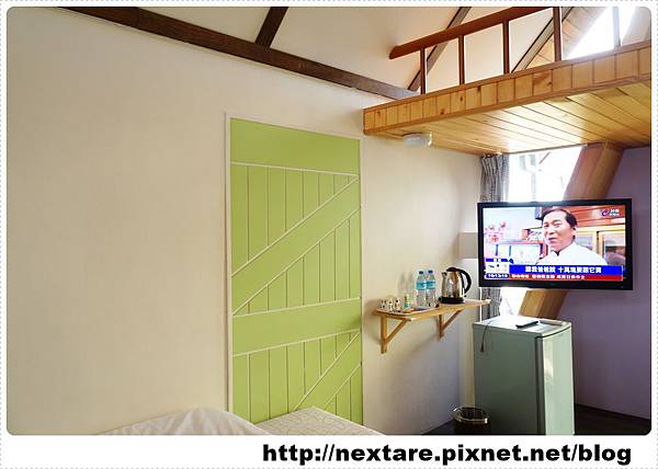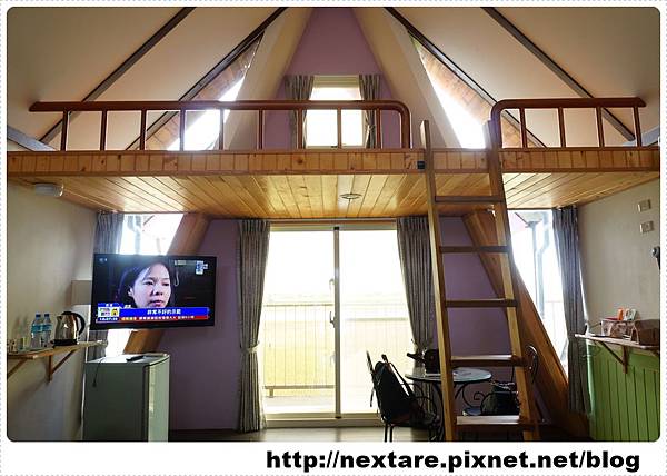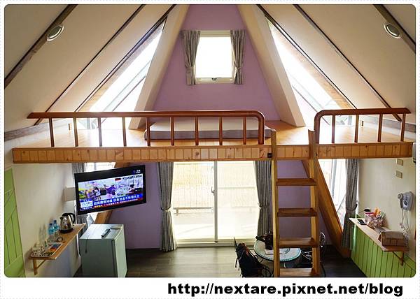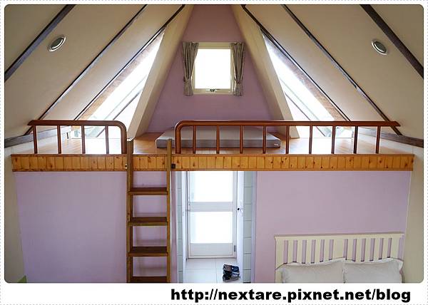 一進到房間,看到的是很特別三角形的屋頂內,左右邊都各有一個小閣樓,樓梯爬上爬下時需多注意安全。