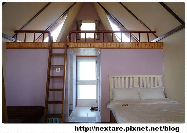 雖然說是七彩小木屋,不過房間總共有八間,多加了粉紅色,可以住2~6人,會依造入住人數增加床墊,房裡有閣樓需要爬樓梯,如果不便的人請要多加注意是否適合,我們這次住的是「紫色屋」。